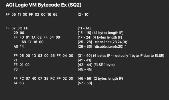 The virtual machine was based around an in-house developed C-like programming language called “Logic”. When the programmer compiled a Logic file, the compiler produced an 8-bit “opcode” for each statement. In the interpreter, each opcode was defined in a jump table which simply pointed to an assembler subroutine. This made the system very fast and ridiculously elegant, because the logic itself never needed to be recompiled no matter what the target platform was. It was also fairly easy to extend the system which can be witnessed by the numerous versions of AGI interpreters produced by Sierra.