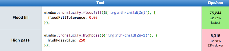 Going further, we wanted to gauge how well either of these methods performed across browsers and devices. We wrote a jsPerf test case: this actually showed us something we didn’t expect but made perfect sense. The simpler high pass filter method of translucifying images was slower than the flood-fill method by a factor of more than 10!